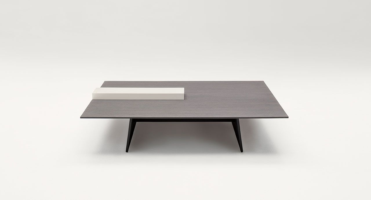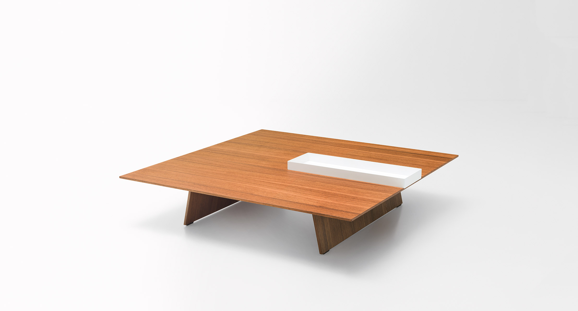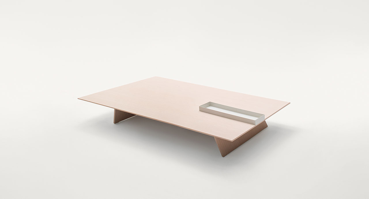 Tavolino completo di vaschetta in metallo verniciato bianco lucido. La serie Kanji comprende anche tavoli da pranzo.