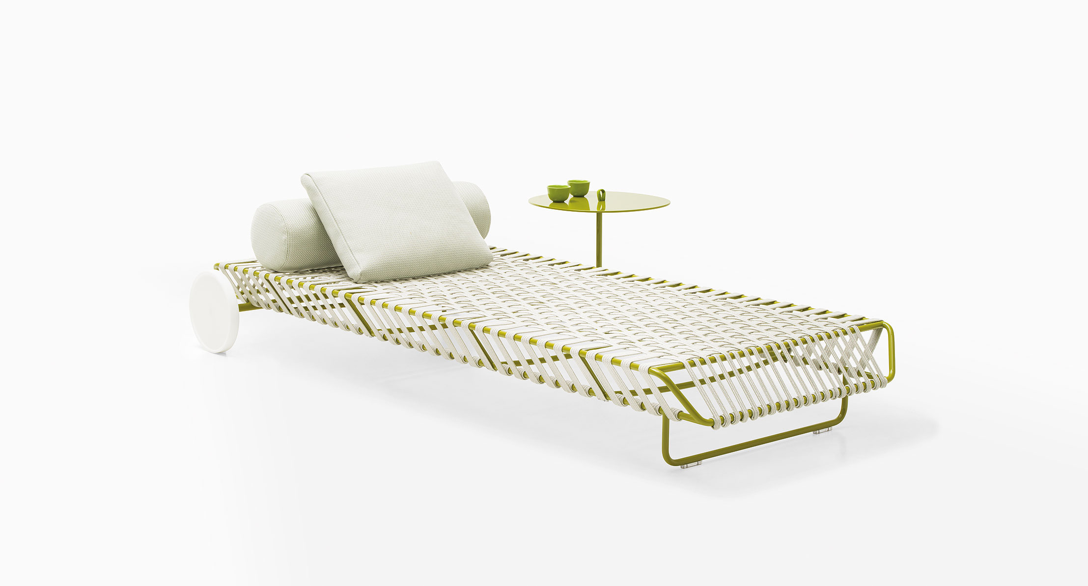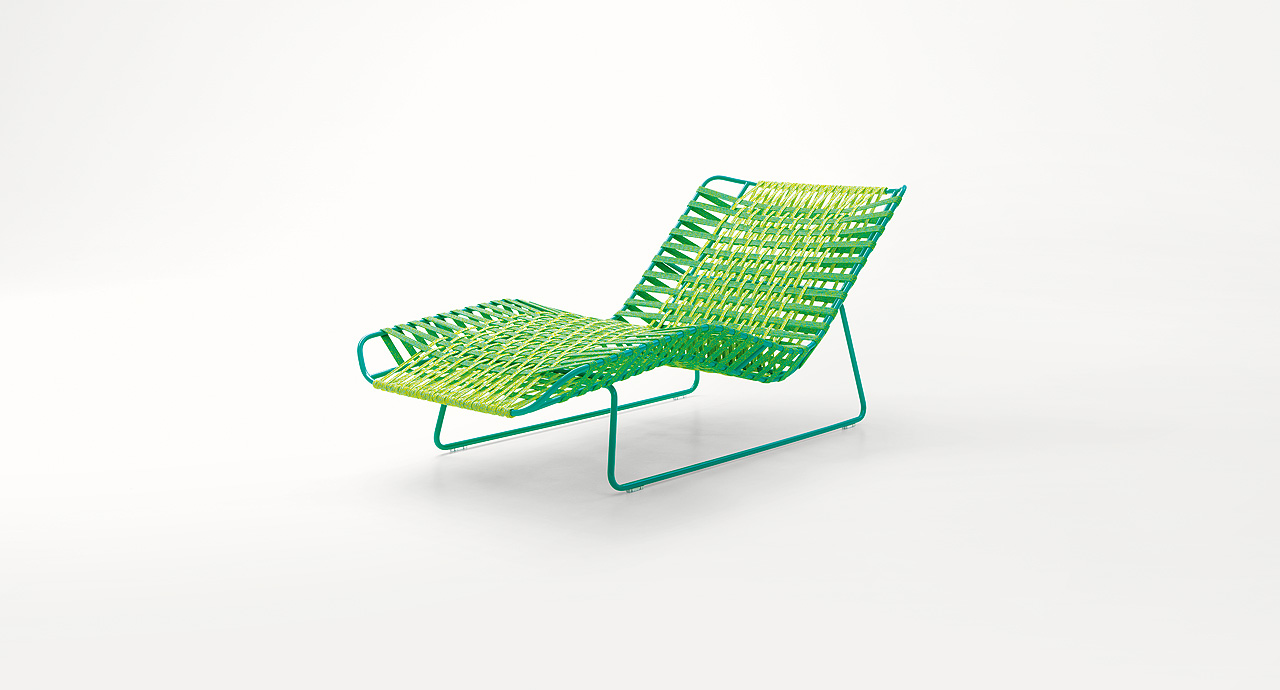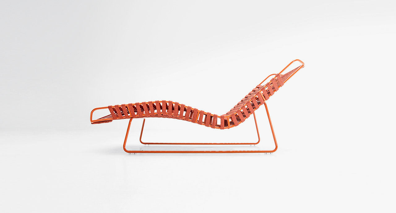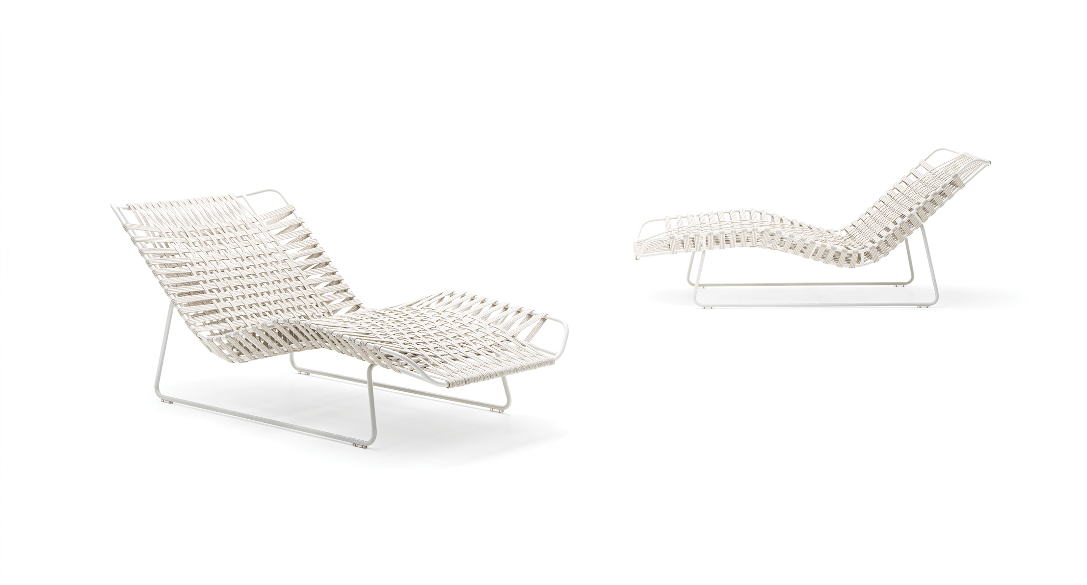 Chaise longue e lettino con rivestimento fisso intrecciato a mano sulla struttura.