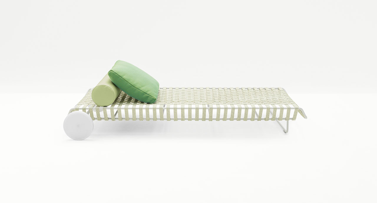 L’intreccio di rivestimento per la chaise longue è disponibile in due versioni, entrambe realizzate con cinghie elastiche di due dimensioni diverse.